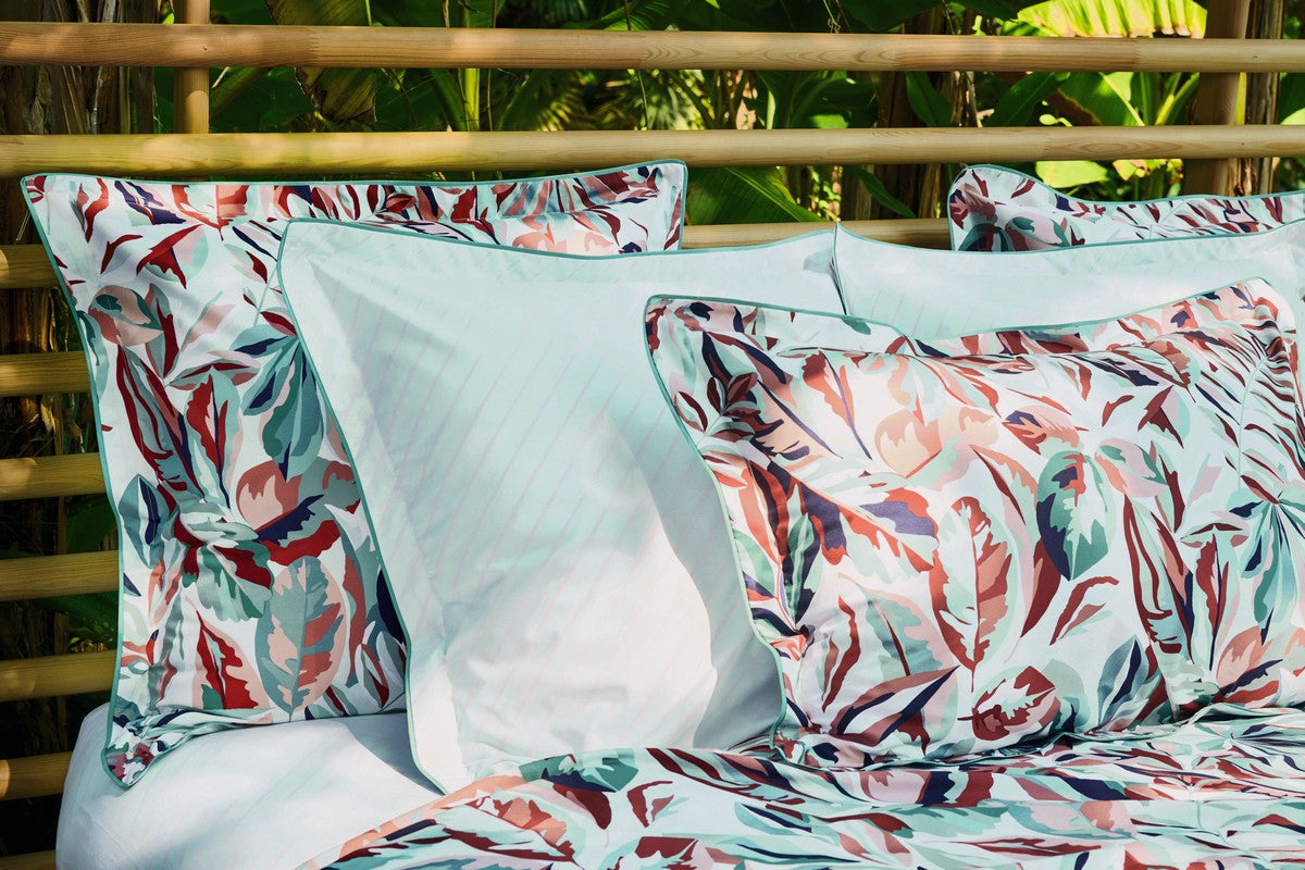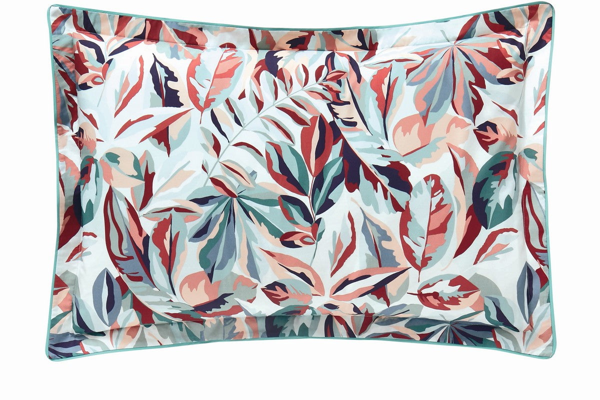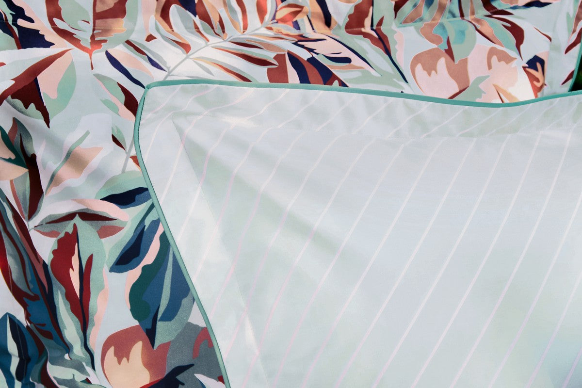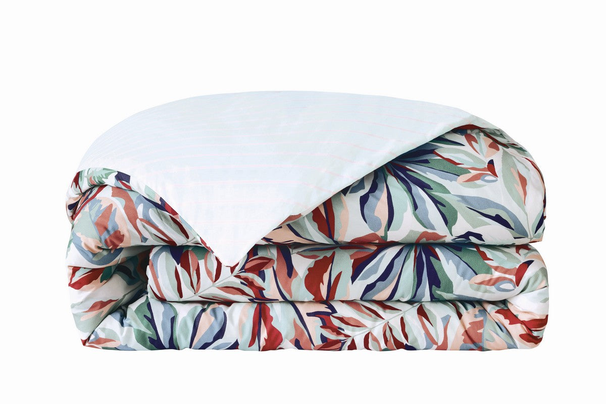 • Duvet covers and shams are reversible. One side has the multicoloured leaves print on a pastel blue ground. The other side has a diagonal stripes print.