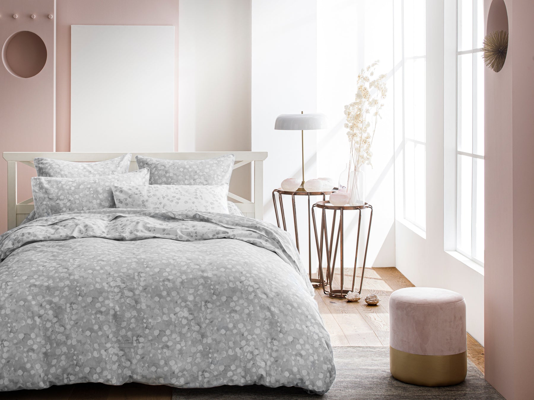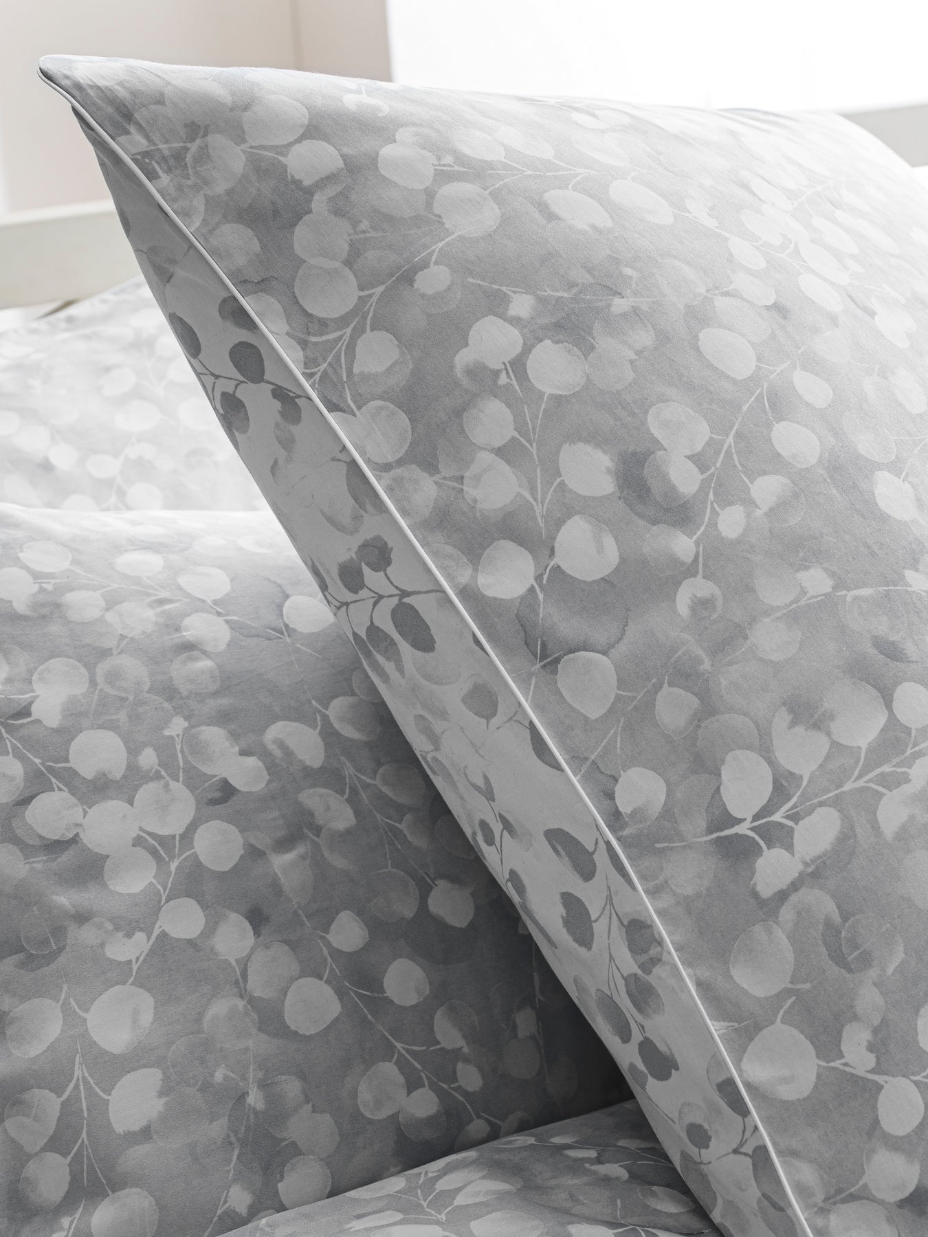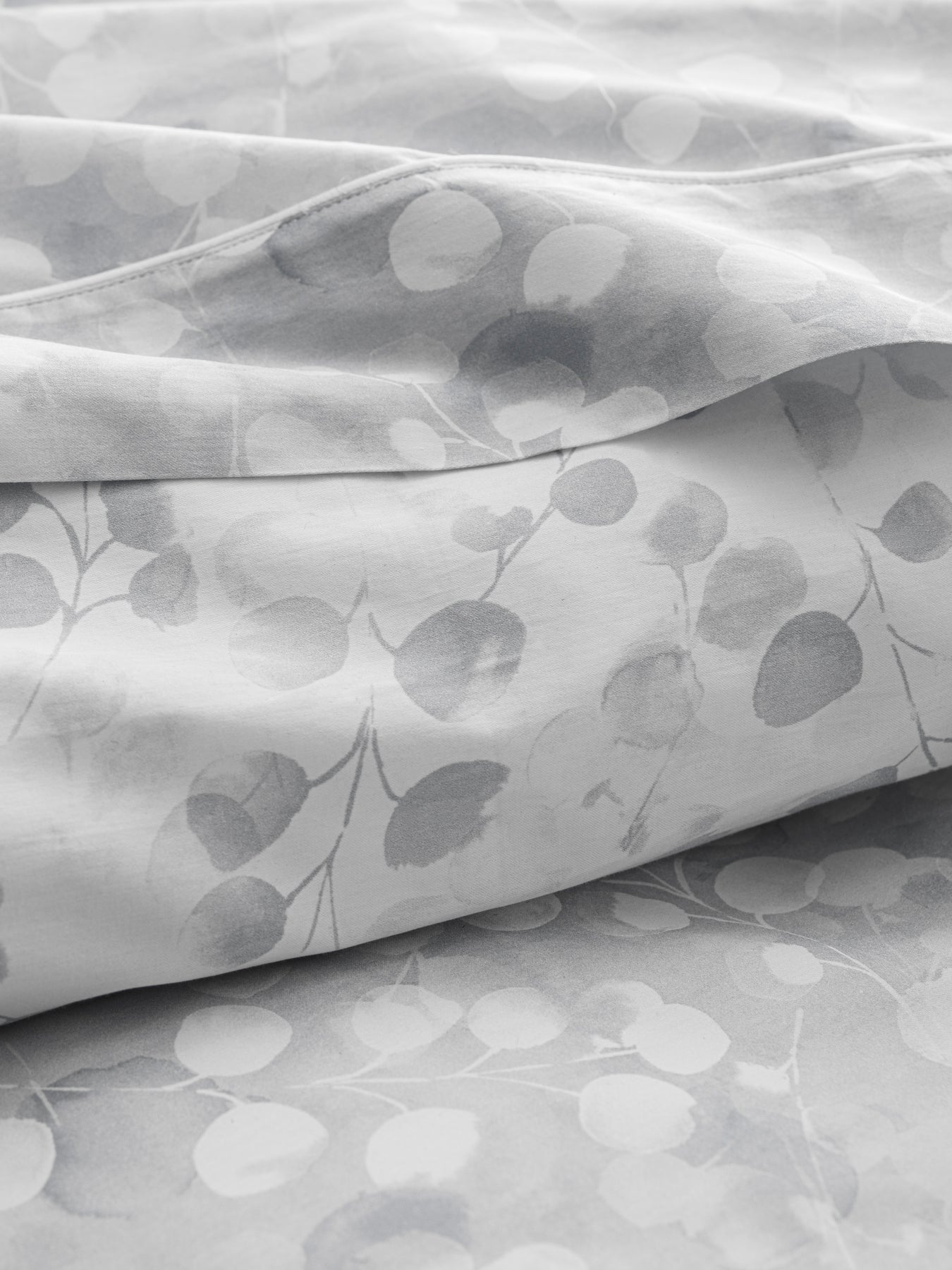 Contemporary styling using a botanical inspiration. Rosée uses a print of Honesty flower seed pod, done in two ways - the seed pods printed in white on an soft grey ground or the print done in the soft grey, on the white ground. The look is fresh, contemporary and very much on-style point. Printed sateen construction.